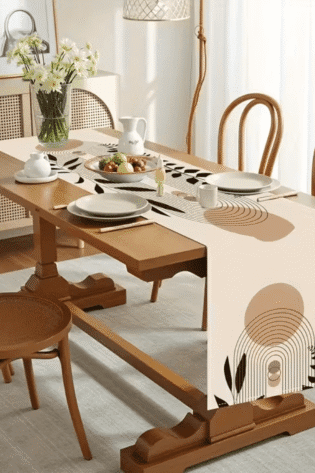 1 Pc, Beige Vintage Asian Cherry Blossom Linen Table Runner – Woven Rectangular Tabletop Decor with Painting Landscape Design.