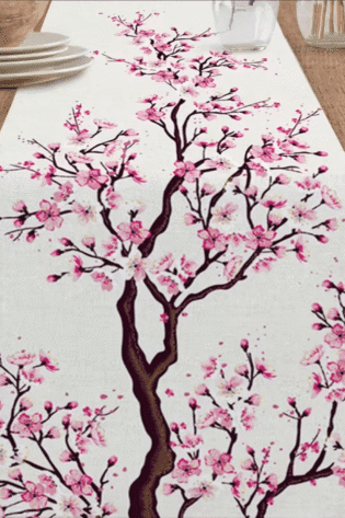 1 Pc, Cherry Blossom Flowers Table Runner, Woven Rectangular Tabletop Decor Asian Japanese Beige.