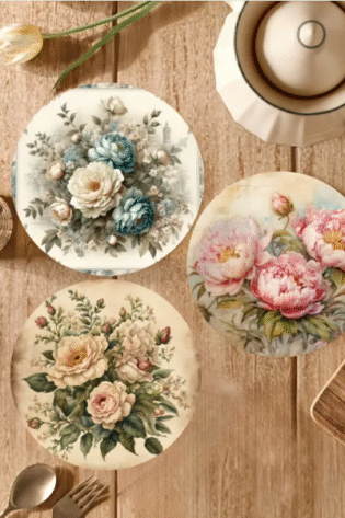 6 pcs Set, Heat-Resistant Wooden Coasters, French Vintage Floral Pattern, High-Quality Durable Absorbent Coasters