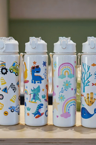 1pc, 23oz cute cartoon pattern plastic water school bottle, with lid, straw, and drawstring.