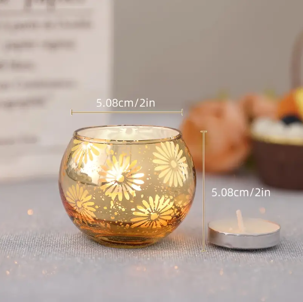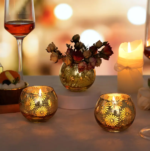 1 review for 3pcs Elegant Glass Votive Candle Holders, Golden Floral Design, Polished Finish, Tabletop Mercury Glass for Décor.