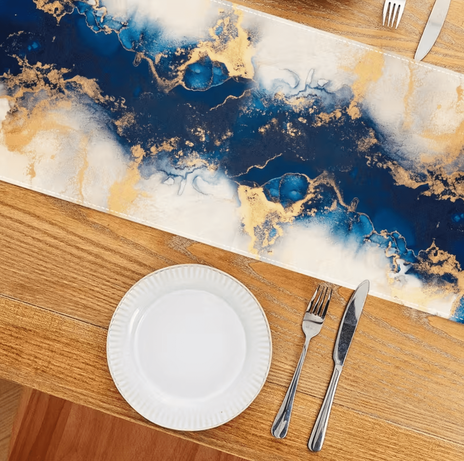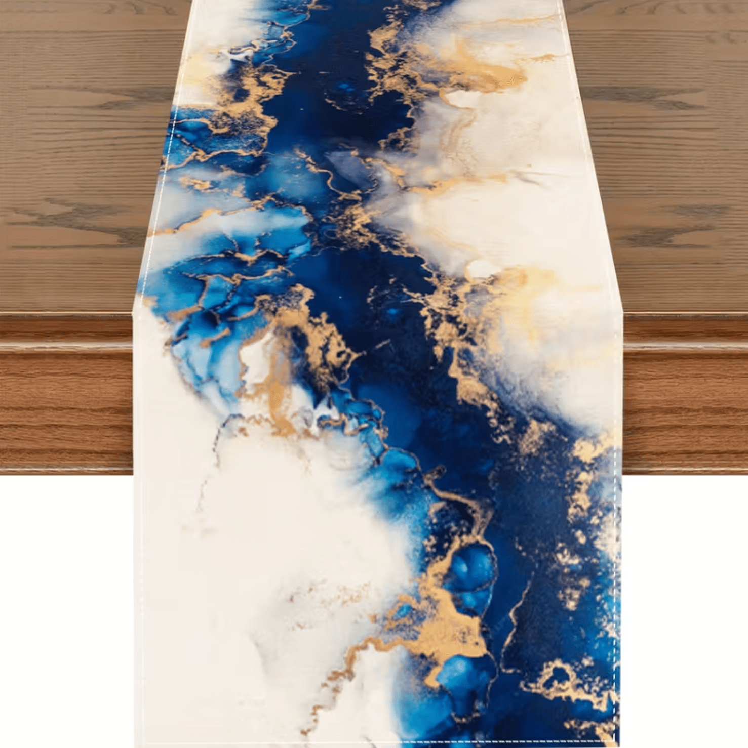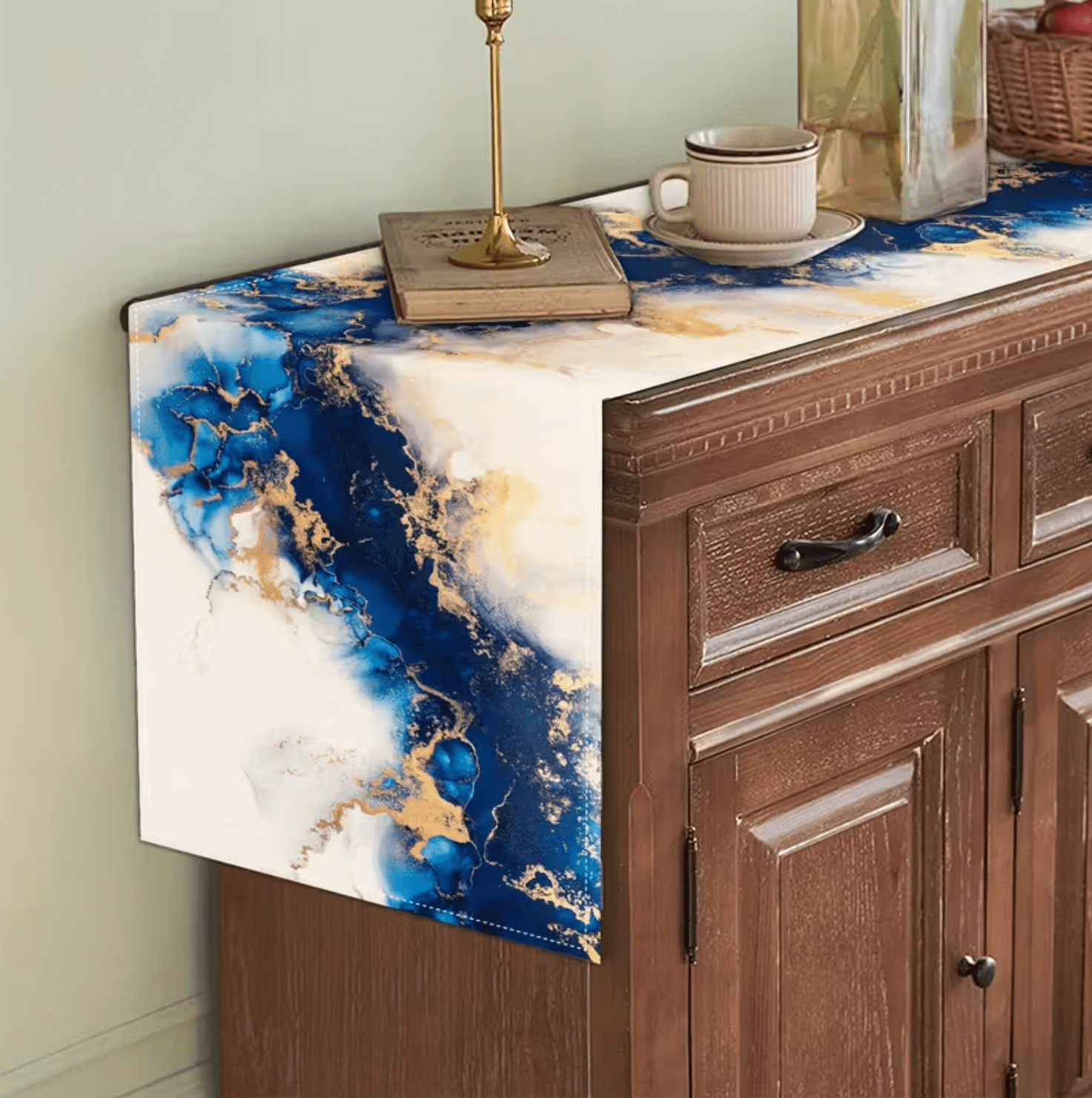 1 Pc, Marble Design Table Runner, Woven Rectangular Tabletop Decor with white clouds/blue Ocean Marble Texture.