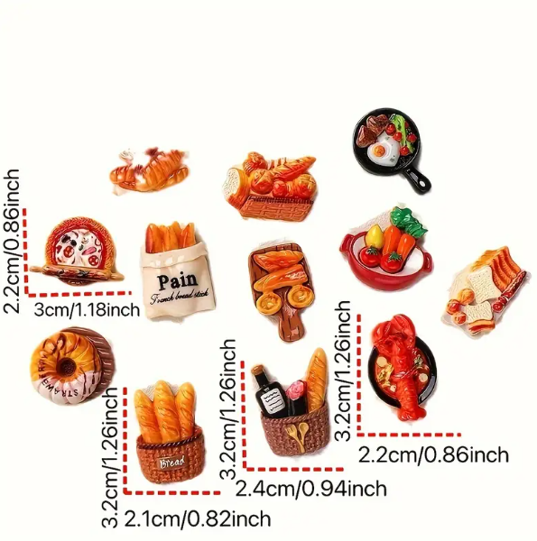 12-Pieces, Set of Charming French Baguette, Toast & Egg Tart Refrigerator Magnets.