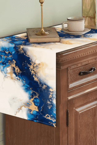 1 Pc, Marble Design Table Runner, Woven Rectangular Tabletop Decor with white clouds/blue Ocean Marble Texture.