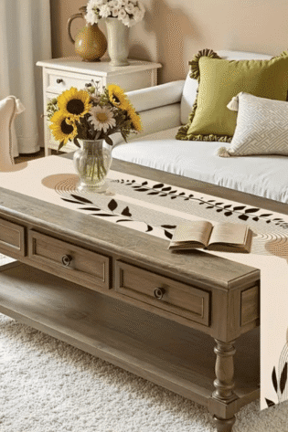1 Pc, Beige Vintage Asian Cherry Blossom Linen Table Runner – Woven Rectangular Tabletop Decor with Painting Landscape Design.