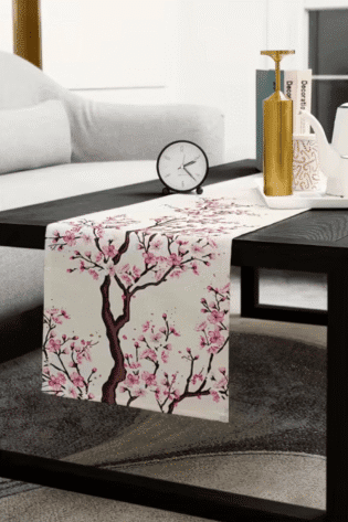 1 Pc, Cherry Blossom Flowers Table Runner, Woven Rectangular Tabletop Decor Asian Japanese Beige.