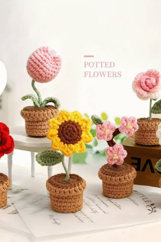 1 Pc, Handmade Crochet Potted Plants – Vibrant Coloured Flower Decor with Brown Pot.