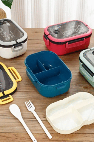 1 Pc, 1200 ml double-layer sealed lunch box with fork and spoon, microwave-safe plastic.